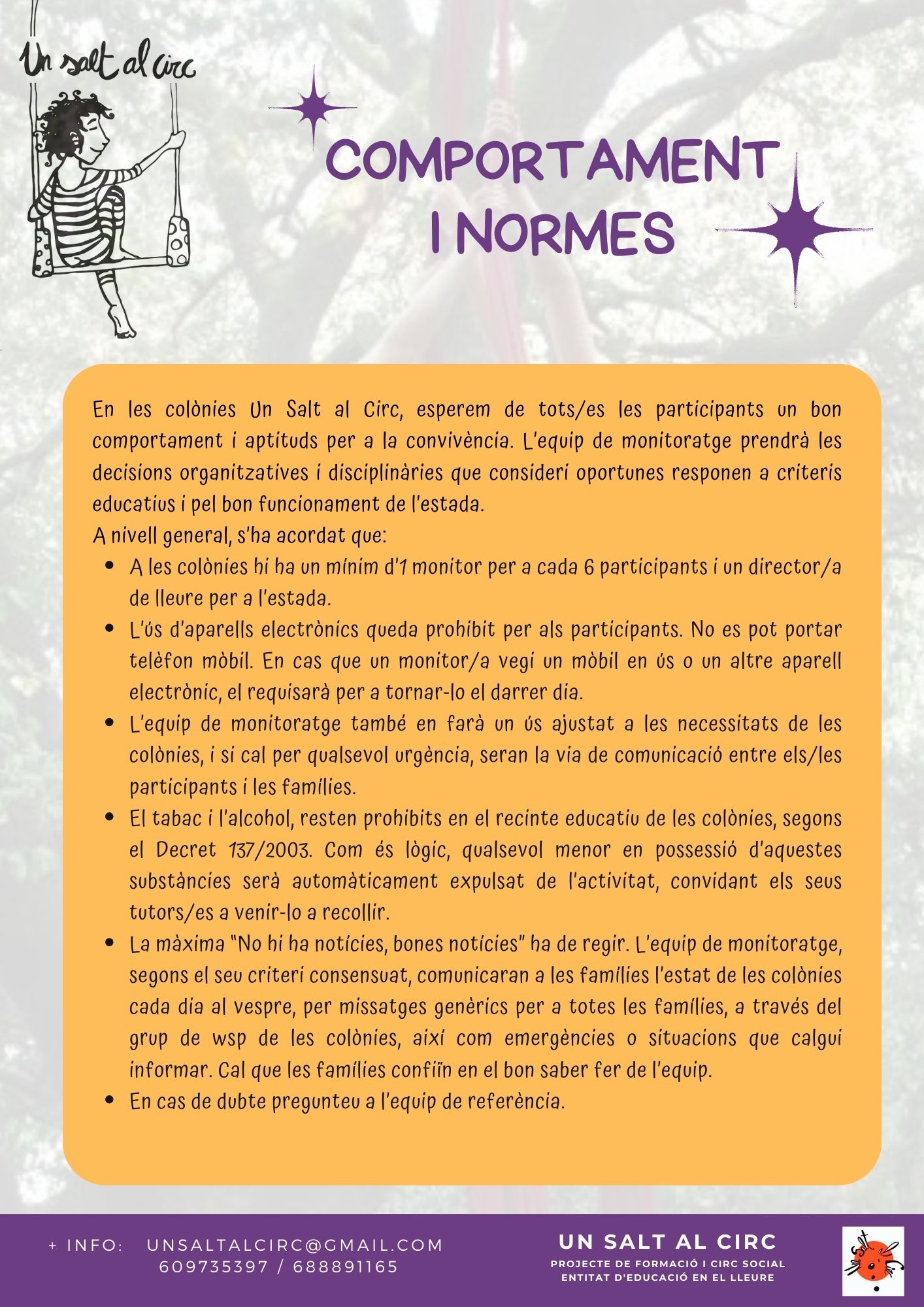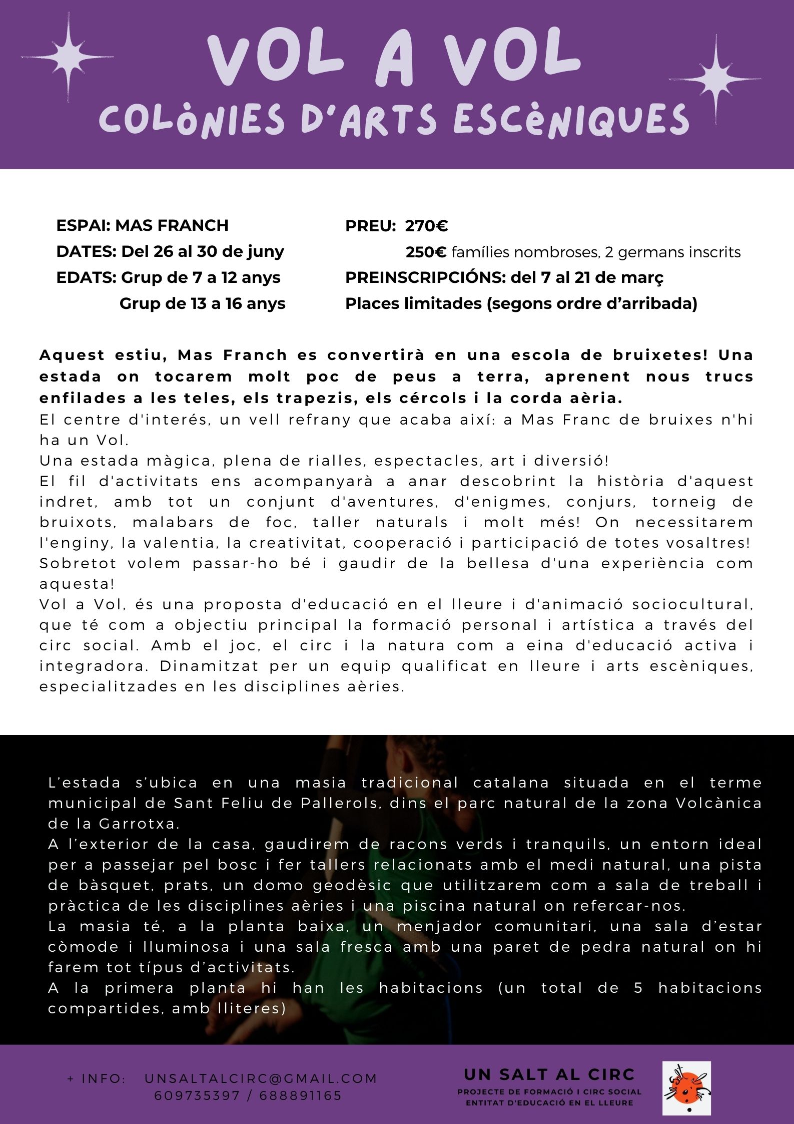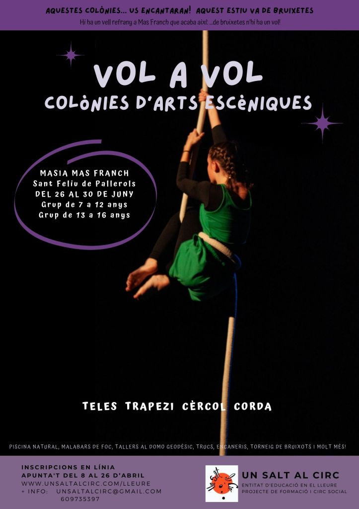 Aquest estiu, Mas Franch es convertirà en una escola de bruixetes! Una estada on tocarem molt poc de peus a terra, aprenent nous trucs enfilades a les teles, els trapezis, els cércols i la corda aèria.
